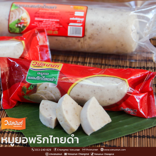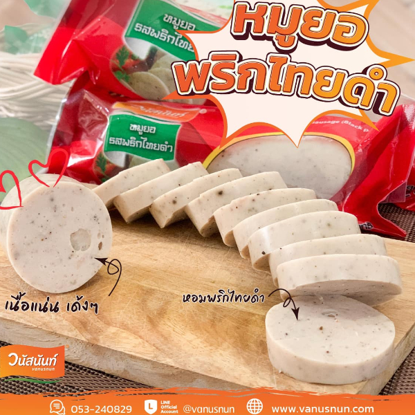 หมูยอพริกไทยดำ วนัสนันท์ ผลิตจากเนื้อหมูคุณภาพดี ปรุงรสด้วยพริกไทยดำแท้ ๆ ที่ให้รสชาติเผ็ดร้อนอ่อน ๆ กลิ่นหอมเป็นเอกลักษณ์ ไม่มีส่วนผสมของแป้ง ไร้มัน ไม่ใส่วัตถุกันเสีย เนื้อแน่นเต็มคำ เคี้ยวหนึบ อร่อยแบบดั้งเดิม รับประกันความสดใหม่ คุณภาพพรีเมียม คุ้มค่าเกินราคา