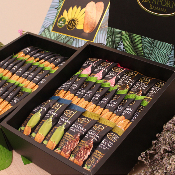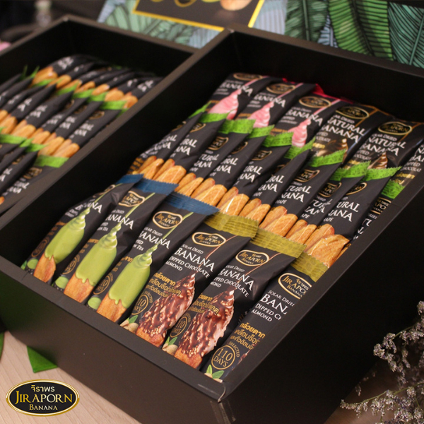 ประกอบด้วยกล้วยตากธรรมชาติ จำนวน 10 ชิ้นกล้วยเคลือบช็อคโกแลต สตรอว์เบอร์รี่ ชาเขียว ช็อคโกแลตอัลมอนด์ อย่างละ 3 ชิ้น