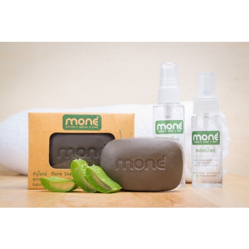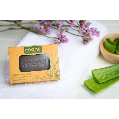 สบู่หินแร่ธรรมชาติโมเน่ สูตรว่านหางจระเข้ ทำความสะอาดผิวหน้าได้อย่างล้ำลึก ด้วยหินแร่บริสุทธิ์ ที่มีองค์ประกอบจาก แคลเซียม โบรไมน์ โปแตสเซียม แมกนีเซียม โซเดียม เป็นต้น ที่ช่วยเรื่องการกระตุ้นการเปลี่ยนแปลงของเซลล์ผิวได้ดีมาก ซึ่งยังไม่มีใครในประเทศไทยที่ผลิตสบู่ที่ใช้หินมาเป็นส่วนผสมมาก่อน จึงสามารถเคลมได้ว่าเป็นเจ้าแรกของประเทศไทย รวมถึงการใช้สารสกัดจากว่านหางจระเข้ พันธ์barbadensis mill มี glycoprotien ช่วยกระชับรูขุมขน ลดรอยคล้ำด่างดำและช่วยทำให้ผิวหน้านุ่มชุ่มชื้นได้เป็นอย่างดี