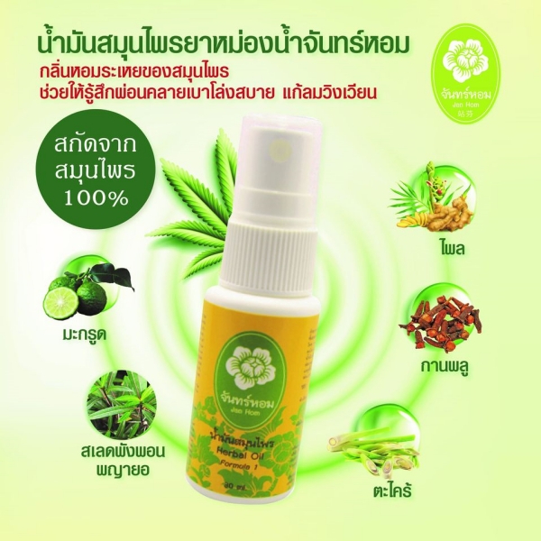 ตัวผลิตภัณฑ์จันทร์หอมธรรมชาติ 100% จากสมุนไพรไทย 100% ไพล,เสลดพังพอน,มะกรูด เป็นน้ำมันธรรมชาติ เมื่อทานวดจะมีฤทธิ์เย็นและค่อยๆร้อนขึ้น นวดผ่อนคลายกล้ามเนื้อ ลดอาการอักเสบ จากแมลงสัตว์กัดต่อย บวม ช้ำ น้ำร้อนลวก ช่วยบรรเทาเริม สะเก็ดเงิน ซึมเร็ว ไม่เหนียว เหนอะแหนะ ไม่เปื้อนเสื้อผ้า ช่วยลดอาการวิงเวียนศีรษะ หน้ามืด ทำให้รู้สึกสดชื่น มีกลิ่นหอมเป็นเอกลักษณ์ ฉีดสเปรย์ ป้องกันการปนเปื้อน (ในขวดสเปรย์ 30 ml.) ไม่แตก