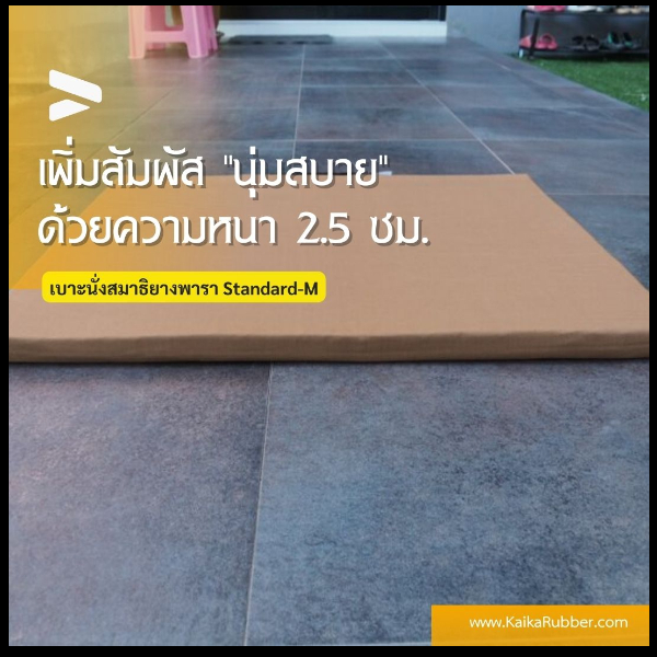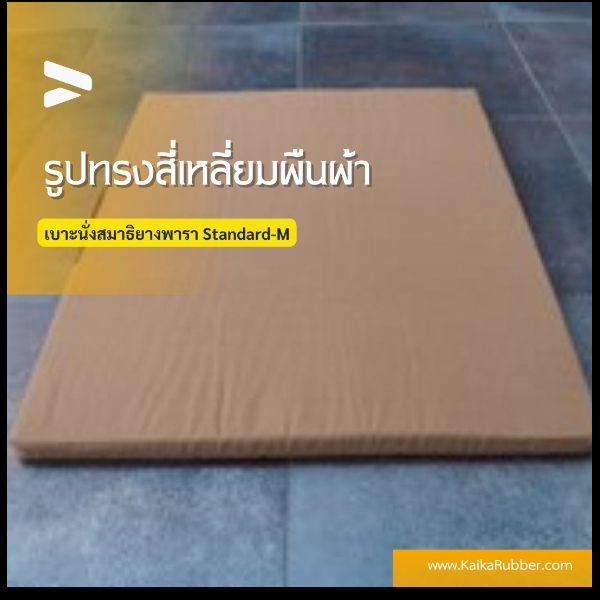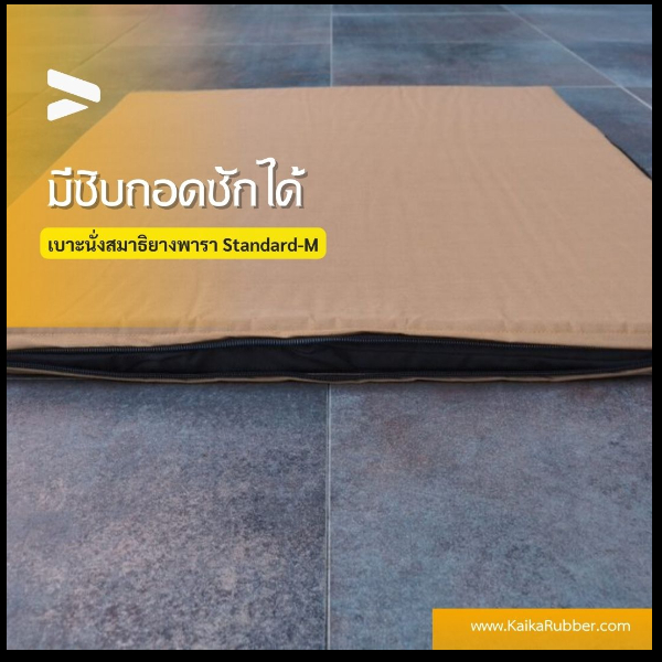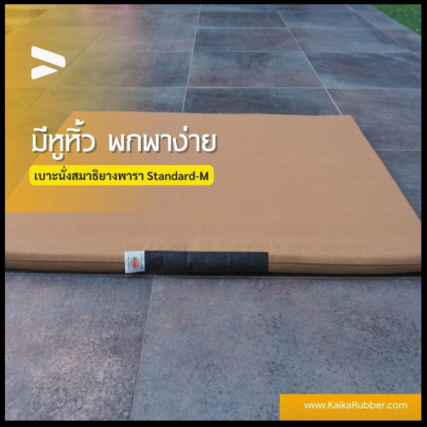 เบาะนั่งสมาธิ Standard-M เบาะนั่งยางพาราแผ่นเรียบความหนา 2.5 ซม. ใช้ปูเสริมรองกับพื้นปูนหรือพื้นไม้ที่มีความแข็ง ได้รับความนิยมสูงสุดในกลุ่มผลิตภัณฑ์ยางพาราแผ่นเรียบ เพราะมีขนาดและความนุ่มที่พอเหมาะ ใช้งานได้กับทุกสถานที่ ทั้งภายในบ้าน วัด หรือตามสถานปฏิบัติธรรมต่างๆ เหมาะแก่การปูรองพื้นเพื่อทำกิจกรรม เช่น สวดมนต์ นั่งสมาธิปฏิบัติธรรมหรือถวายเป็นอาสนะสงฆ์ รับน้ำหนักได้มากถึง 120 กก. ผลิตจากยางพาราแท้ 100% มีซิบถอดซักได้ง่าย