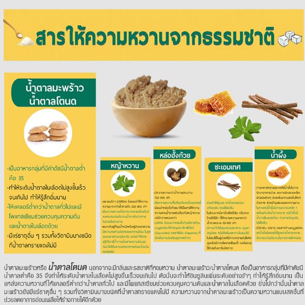 -มีค่าดัชนีน้ำตาลต่ำ (Low GI Sugar) น้ำตาลจะดูดซึมเข้ากระแสเลือดช้า ส่งผลให้ระดับน้ำตาลในเลือดไม่เพิ่มอย่างรวดเร็ว