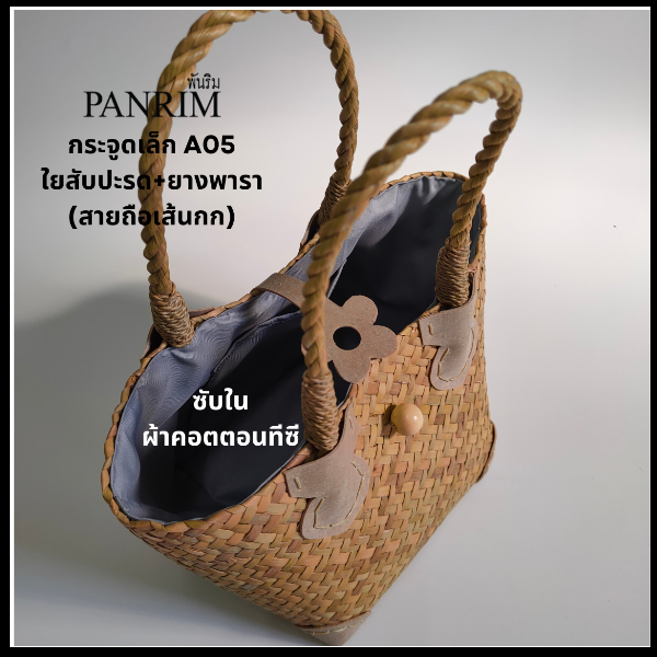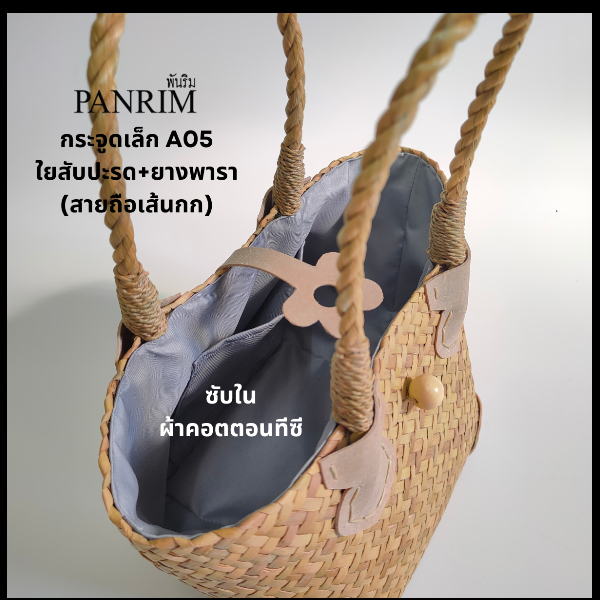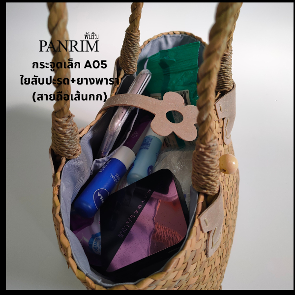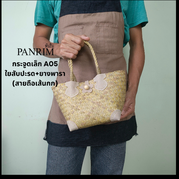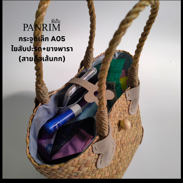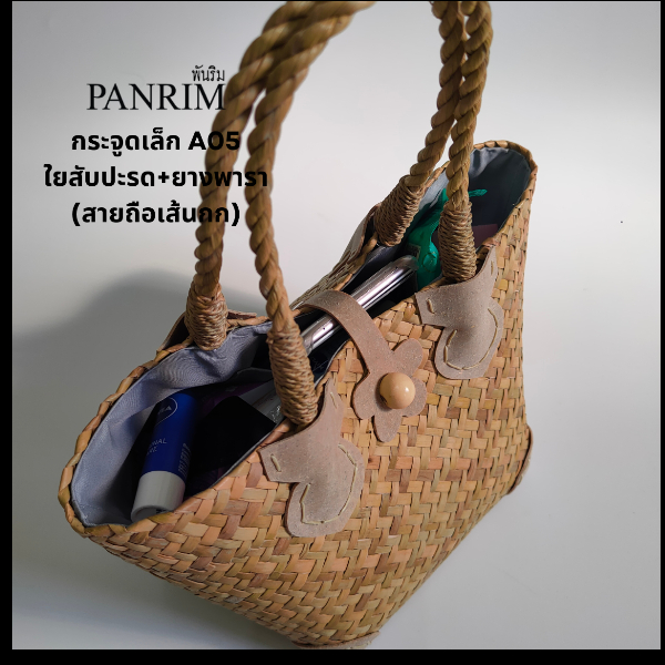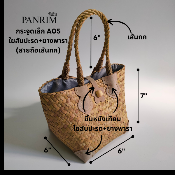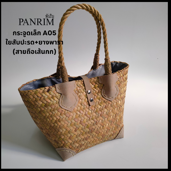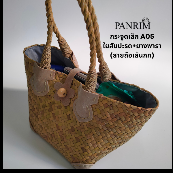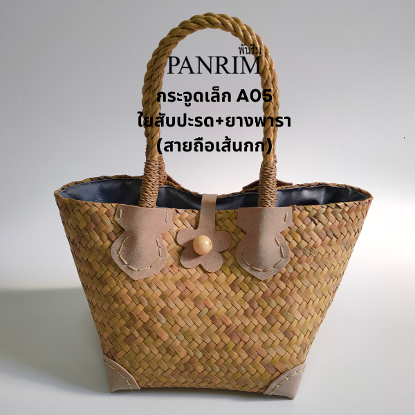สินค้าผลิตภภัณฑ์จากชุมชน กระเป๋ากระจูด ที่มีการเพิ่มชิ้นส่วนหนังเทียมที่ทำจากเส้นใยสับปะรดและยางพารา เข้่ามาอยู่ในกระจูดใบนี้ ทั้งมุมก้นทั้ง 4 มุม ตัวปิดข้อต่อสายถือ หนังเทียมชนิดนี้ผลิตขึ้นมาจากกระบวนการย่อยใบสับปะรดและนำมาผสมรวมกันยางพารา เพื่อเป็นการช่วยเหลือเกษตรกรทั้งชาวสวนยางและชาวสวนสับปะรด