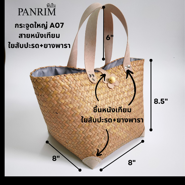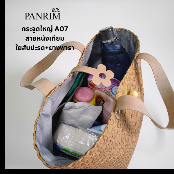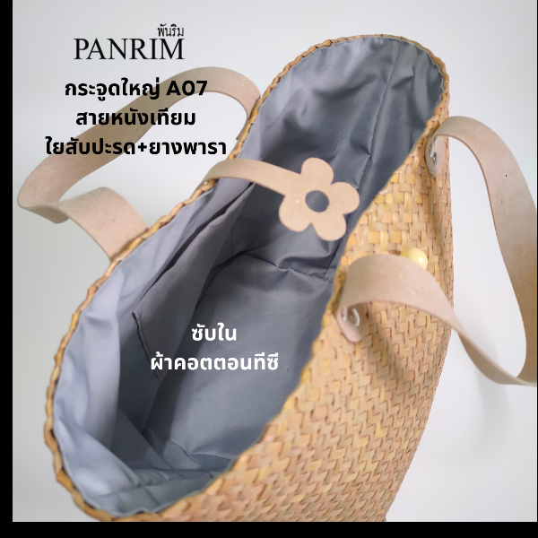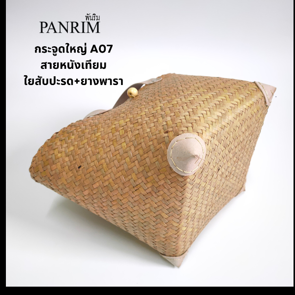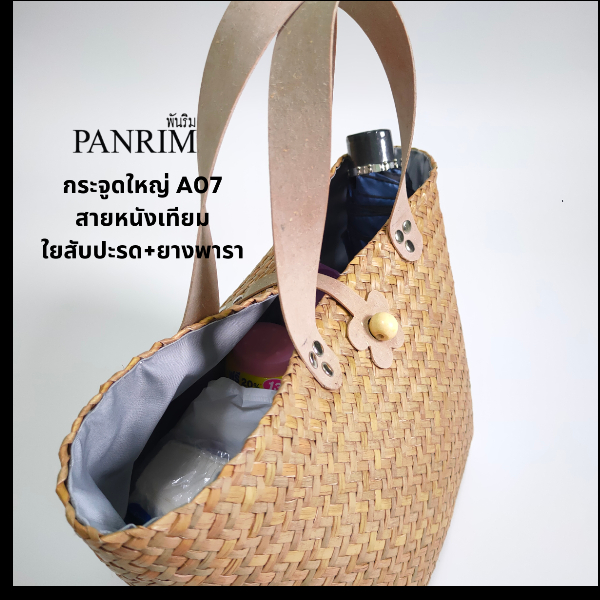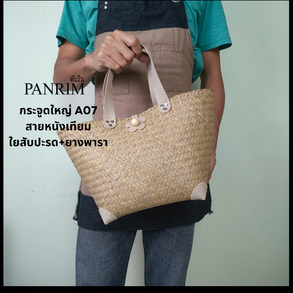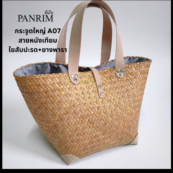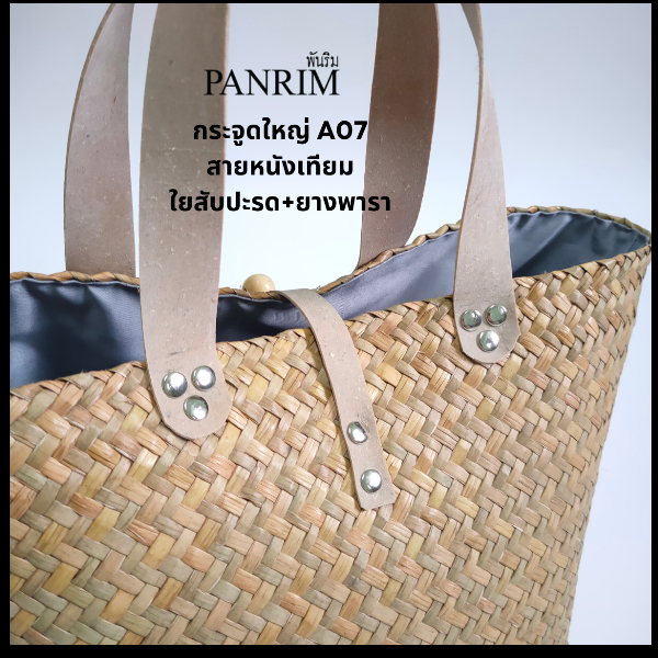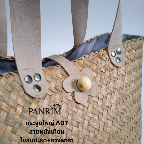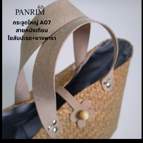 สินค้าผลิตภภัณฑ์จากชุมชน กระเป๋ากระจูด ที่มีการเพิ่มชิ้นส่วนหนังเทียมที่ทำจากเส้นใยสับปะรดและยางพารา เข้ามาอยู่ในกระจูดใบนี้ ทั้งมุมก้นทั้ง 4 มุม สายถือหนังเทียม หนังเทียมชนิดนี้ผลิตขึ้นมาจากกระบวนการย่อยใบสับปะรดและนำมาผสมรวมกันยางพารา เพื่อเป็นการช่วยเหลือเกษตรกรทั้งชาวสวนยางและชาวสวนสับปะรด
