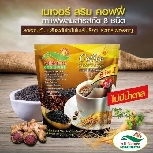 - กาแฟผสมสารสกัด 8 ชนิด ได้แก่ งาดำคั่วบด ถั่วขาวสกัด โสมสกัด กระชายดำ(โสมไทย) ครีมถั่วเหลือง ซูคราโรส เป็นต้น มีไฟเบอร์สูง ไม่มีน้ำตาล ช่วยลดความดัน ปรับระดับไขมันในเส้นเลือด เร่งการเผาผลาญ ช่วยในการย่อย ดูดซึม และระบบขับถ่าย เหมาะสำหรับผู้ที่ต้องการควบคุมน้ำหนัก