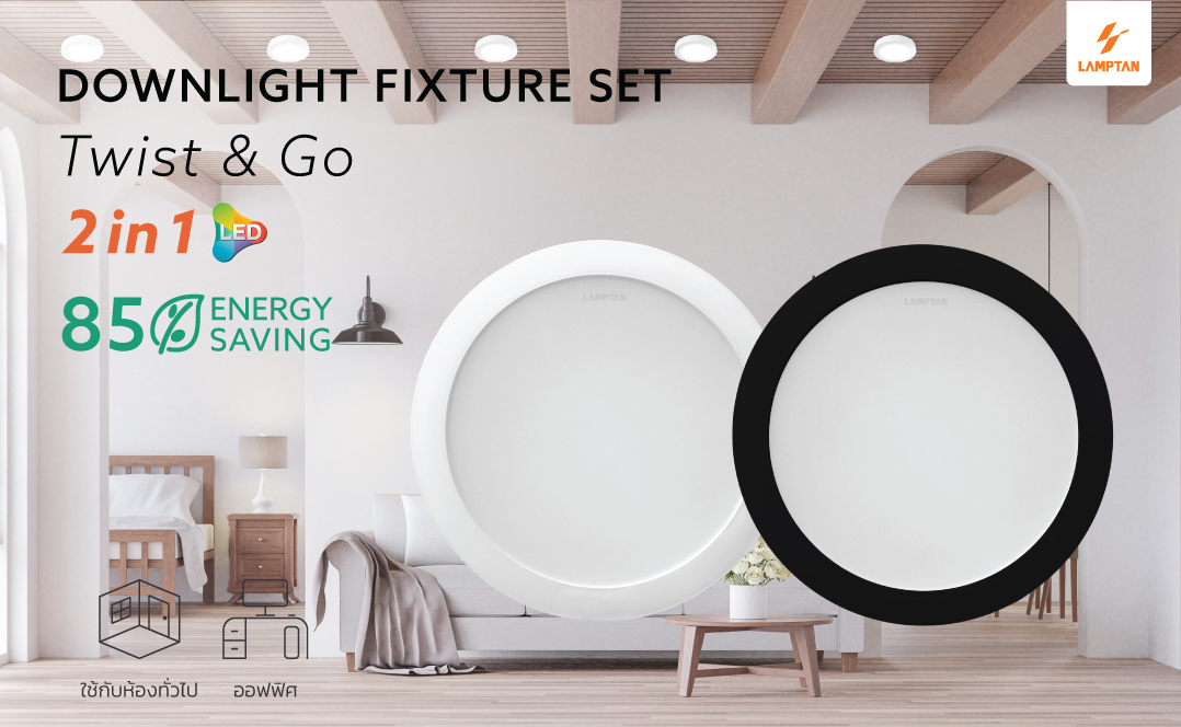 DOWNLIGHT FIXTURE SET รุ่น TWIST & GO 2 in 1 จาก LAMPTAN โคมไฟแอลอีดีดาวน์ไลท์ที่สามารถติดตั้งได้ถึง 2 รูปแบบ คือติดตั้งแบบลอยโดยยึดกับฝ้าได้ทันทีไม่ต้องเจาะฝ้าหรือแบบฝังฝ้าและยังสามารถเปลี่ยนโคมไฟได้ง่ายสะดวกเพียงหมุนโคมไฟเดิมออกและหมุนโคมไฟใหม่ให้เข้าล็อค รูปทรงโมเดิร์น เรียบง่าย มีให้เลือกทั้งรุ่นสีดำสไตล์ LOFT และสีขาวแบบ MINIMAL เหมาะสำหรับตกแต่ง บ้านพัก คอนโดมิเนียม หรือออฟฟิตทั่วไป